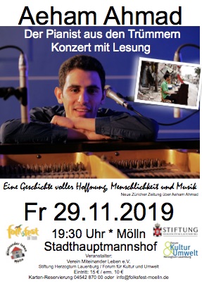 Der syrische Pianist und Sänger Aeham Ahmad, bekannt auch durch sein autobiografisches Buch „Und die Vögel werden singen“, kommt nach Mölln. Ahmads Auftritte im Stadthauptmannshof und in Schulen sind ein Nachklang zu den Gedenkveranstaltungen zu den Möllner Brandanschlägen und der Auftakt zur 16.Saison des Internationalen Möllner Folksfestes, bei dem immer wieder Rassismus und Flucht künstlerisch thematisiert werden.